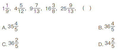 解析:整數(shù)部分分別是 12,22,32,42,52,所以下一項(xiàng)應(yīng)該是62,排除 A、D。分?jǐn)?shù)部分的分母與分子的差分別是 8,7,6,5,4,所以下一項(xiàng)應(yīng)該是 3。因此,選擇 C 選項(xiàng)。