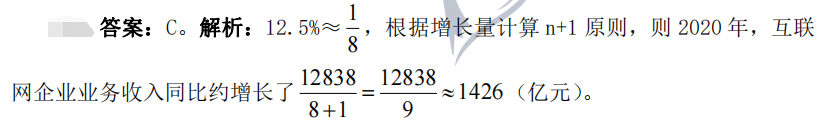 解析:根據(jù)兩期比重比較口訣,部分增速大于整體增速,比重上升,反之,比重下降。2020 年我國規(guī)模以上互聯(lián)網(wǎng)和相關(guān)服務(wù)企業(yè)(以下簡稱互聯(lián)網(wǎng)企業(yè))業(yè)務(wù)收入同比增長 12.5%,即整體增速 12.5%,材料中已知 2020 年東、中、西和東北地區(qū)同比增速分別為 14.8%、3.4%、6.9%和 9.1%,僅東部地區(qū)增速 14.8%>整體增速 12.5%,比重上升??紤] 2019 年,2019 年我國規(guī)模以上互聯(lián)網(wǎng)和相關(guān)服務(wù)企業(yè)(以下簡稱互聯(lián)網(wǎng)企業(yè))業(yè)務(wù)收入同比增長 12.5%+8.9%=21.4%,2019 年東部地區(qū)互聯(lián)網(wǎng)業(yè)務(wù)收入同比增速為 14.8%+9%=23.8%;東部地區(qū)增速 23.8%>整體增速21.4%。故 2019 年和 2020 年互聯(lián)網(wǎng)業(yè)務(wù)收入占全國比重均高于上年水平的地區(qū)只有1個東部地區(qū)。