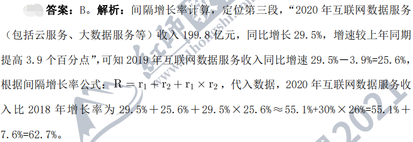 解析:2019 年互聯(lián)網(wǎng)企業(yè)信息服務(wù)收入同比增速為 11.5%+11.2%=22.7%;2019 年互聯(lián)網(wǎng)接入及相關(guān)服務(wù)收入同比增速為 11.5%+20.8%=32.3%。故2019 年,互聯(lián)網(wǎng)企業(yè)互聯(lián)網(wǎng)接入及相關(guān)服務(wù)收入同比增速比同年信息服務(wù)收入同比增速高 32.3%-22.7%=9.6%,高不到 10 個百分點。