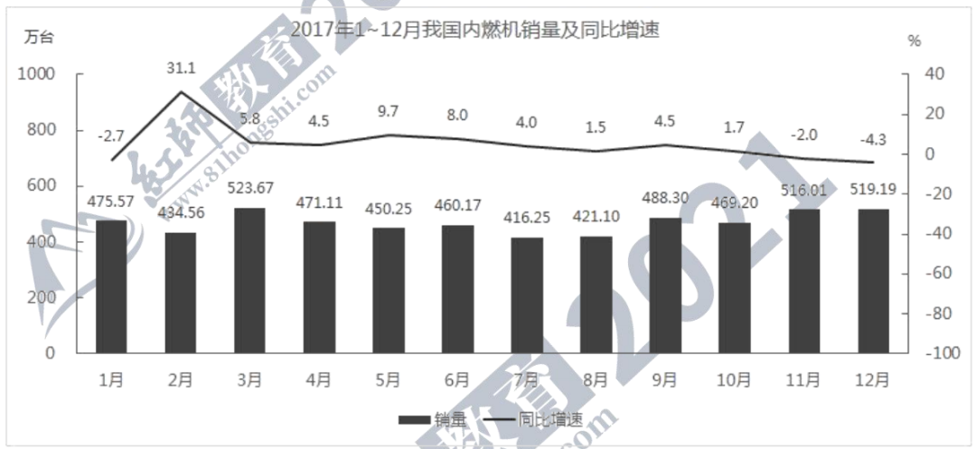 解析:2017 年 6 月內(nèi)燃機(jī)銷量為 460.17 萬臺,同比增速為 8%,增長量為460.17÷(12.5+1)=34 萬臺。