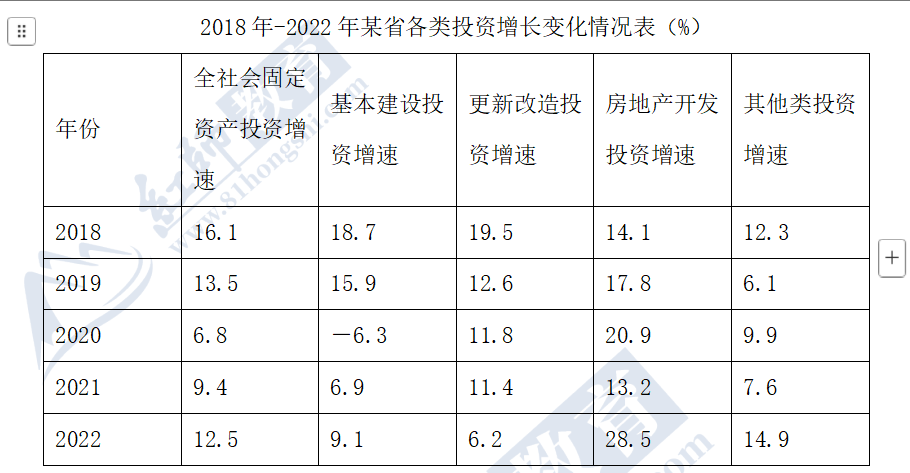 1. 從平均水平來(lái)看,該省各類投資增長(zhǎng)最快的年份是( )年。