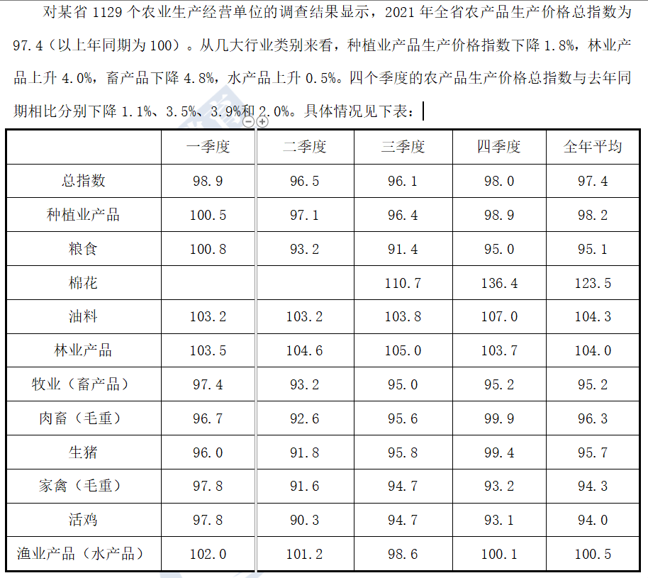 2.答案:A。解析:考點直接查找型。通過表格數(shù)據(jù)可知,油料價格持續(xù)升高,林業(yè)產(chǎn)品在第四季度下降,水產(chǎn)品在二、三季度下降,棉花在第一、二季度無數(shù)據(jù),故本題答案為A。