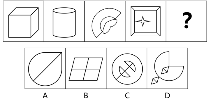 90.答案:D。解析:元素組成不同,優(yōu)先考慮屬性規(guī)律。觀察發(fā)現(xiàn),題干圖形均為軸對(duì)稱圖形,考慮對(duì)稱軸的方向和數(shù)量。題干圖形均只有一條對(duì)稱軸,并且對(duì)稱軸的方向依次逆時(shí)針旋轉(zhuǎn),故?處應(yīng)選擇只有1條豎對(duì)稱軸的圖形,且對(duì)稱軸方向?yàn)樾毕蛴疑系?,排除B項(xiàng)。繼續(xù)觀察,發(fā)現(xiàn)題干圖形中對(duì)稱軸經(jīng)過圖形面的個(gè)數(shù)分別為1、2、3、4,故?處應(yīng)選擇對(duì)稱軸經(jīng)過5個(gè)面的圖形,A項(xiàng)經(jīng)過0個(gè)面,C項(xiàng)經(jīng)過1個(gè)面,D項(xiàng)經(jīng)過5個(gè)面,只有D項(xiàng)符合。故本題答案為D。
