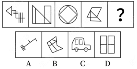 91.答案:B。解析:元素組成不同,且無明顯屬性規(guī)律,優(yōu)先考慮數(shù)量規(guī)律。觀察發(fā)現(xiàn),題干圖形均由1部分構成,故?處應選擇1部分的圖形。A項為3部分,B項為1部分,C項為5部分,D項為2部分,只有B項符合。故本題答案為B。
