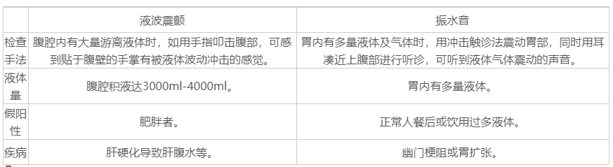 液波震顫和振水音均為腹部觸診的診察體征,兩者均因游離液體或氣體而產(chǎn)生,但是兩者的游離液體所在的位置截然不同,所對應(yīng)的臨床疾病也截然不同。且兩者在臨床診察中,不然各自均易出現(xiàn)假陽性體征,還容易互相混淆,因此在臨床診察以及考試時需要明確各自的定義,并能夠?qū)⒃\察結(jié)果相區(qū)別。