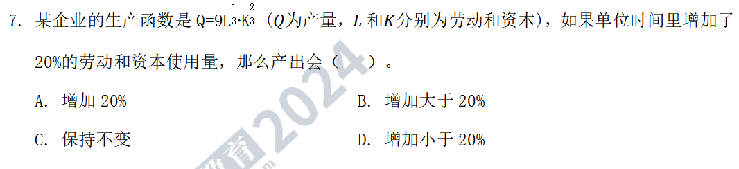 7.答案:A。解析:本題考查規(guī)模報酬的含義。規(guī)模報酬分析是考查當(dāng)企業(yè)內(nèi)部各種生產(chǎn)要素投入量按相同比例變化時所帶來的產(chǎn)量變化,分為規(guī)模報酬不變、規(guī)模報酬遞減和規(guī)模報酬遞增。產(chǎn)量增加的比例等于各種要素投入量增加的比例,稱為規(guī)模報酬不變;產(chǎn)量增加的比例小于各種要素投入量增加的比例,稱為規(guī)模報酬遞減;產(chǎn)量增加的比例大于各種要素投入量增加的比例,稱為規(guī)模報酬遞增。該函數(shù)為柯布道格拉斯生產(chǎn)函數(shù),且具有規(guī)模報酬不變的經(jīng)濟(jì)特征,所以,勞動和資本均增加20%,產(chǎn)量也增加20%。故正確答案為A。