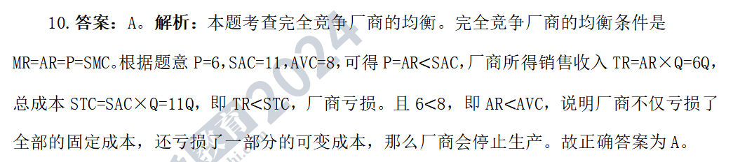 10. 某企業(yè)生產(chǎn)的商品價格為6元,平均成本為11元,平均可變成本為8元。則該企業(yè)在