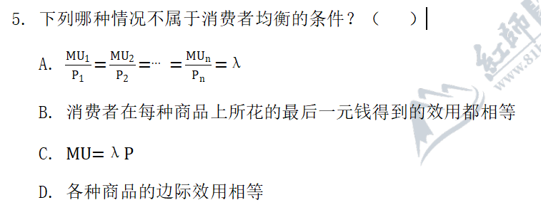 5.答案:D。解析:本題考查的是基數(shù)效用論的均衡條件。基數(shù)效用論的均衡條件為每種商品的邊際效用與價格之比都相等,而且等于貨幣的邊際效用。選項A,是多種商品的效用最大化表達式;選項B,是對表達式的另外一種表達方式,也是對推導(dǎo)均衡表達式過程的理解;選項C,是一種商品的均衡條件表達式;選項D,各種商品的邊際效用相等,忽略了價格因素,故錯誤。故正確答案為選項D。