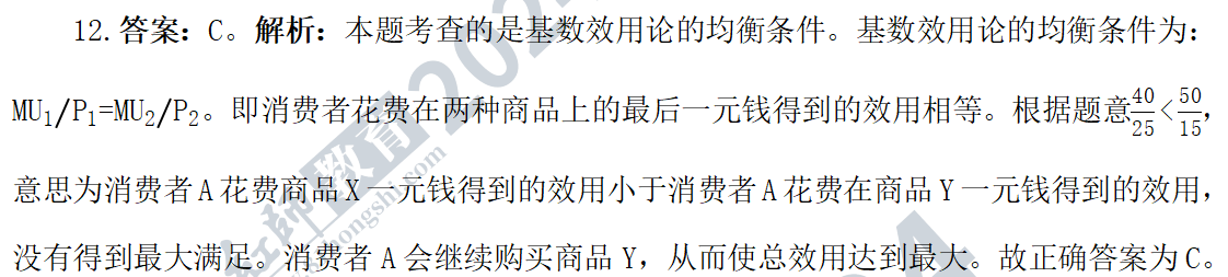 12. 若消費者A只準備買兩種商品X和Y,X的價格為25,Y的價格為15。若A買了9個單位X和4個單位Y,所獲得的邊際效用值分別為40個單位和50個單位,則( )。