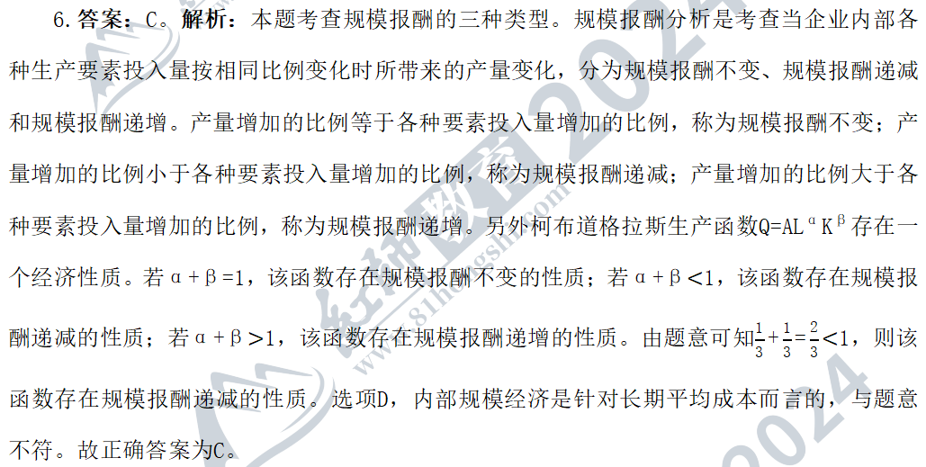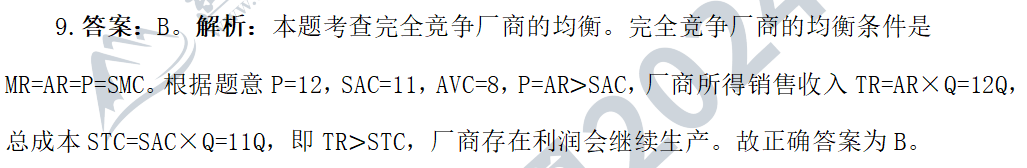 8.答案:C。解析:本題考查總成本曲線與短期成本曲線之間的關(guān)系。長(zhǎng)期總成本曲線是廠商在長(zhǎng)期中在每一產(chǎn)量水平上通過(guò)選擇最大的生產(chǎn)規(guī)模所能達(dá)到的最低總成本。從圖形上看,長(zhǎng)期總成本曲線是短期總成本曲線的包絡(luò)線,故選項(xiàng)A表述正確;長(zhǎng)期平均成本曲線是廠商在長(zhǎng)期內(nèi)按產(chǎn)量平均計(jì)算的最低總成本,從圖形上看,長(zhǎng)期平均成本是短期總成本曲線的包絡(luò)線,故選項(xiàng)B表述正確。長(zhǎng)期邊際成本是廠商在長(zhǎng)期內(nèi)增加一單位產(chǎn)量所引起的最低總成本的增量。在某一產(chǎn)量上,長(zhǎng)期邊際成本與短期邊際成本相等,故選項(xiàng)C表述錯(cuò)誤;在長(zhǎng)期生產(chǎn)過(guò)程中,廠商可以調(diào)整所有生產(chǎn)要素的投入數(shù)量,從而選擇最優(yōu)的生產(chǎn)規(guī)模,甚至進(jìn)入退出一個(gè)行業(yè),故選項(xiàng)D表述正確。故正確答案為C。