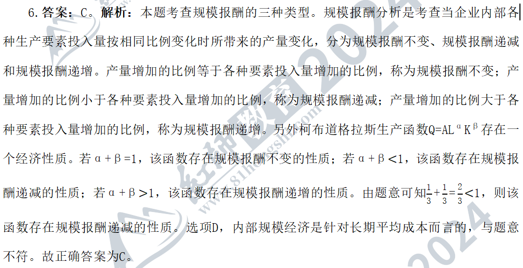 8.答案:C。解析:本題考查總成本曲線與短期成本曲線之間的關(guān)系。長(zhǎng)期總成本曲線是廠商在長(zhǎng)期中在每一產(chǎn)量水平上通過(guò)選擇最大的生產(chǎn)規(guī)模所能達(dá)到的最低總成本。從圖形上看,長(zhǎng)期總成本曲線是短期總成本曲線的包絡(luò)線,故選項(xiàng)A表述正確;長(zhǎng)期平均成本曲線是廠商在長(zhǎng)期內(nèi)按產(chǎn)量平均計(jì)算的最低總成本,從圖形上看,長(zhǎng)期平均成本是短期總成本曲線的包絡(luò)線,故選項(xiàng)B表述正確。長(zhǎng)期邊際成本是廠商在長(zhǎng)期內(nèi)增加一單位產(chǎn)量所引起的最低總成本的增量。在某一產(chǎn)量上,長(zhǎng)期邊際成本與短期邊際成本相等,故選項(xiàng)C表述錯(cuò)誤;在長(zhǎng)期生產(chǎn)過(guò)程中,廠商可以調(diào)整所有生產(chǎn)要素的投入數(shù)量,從而選擇最優(yōu)的生產(chǎn)規(guī)模,甚至進(jìn)入退出一個(gè)行業(yè),故選項(xiàng)D表述正確。故正確答案為C。