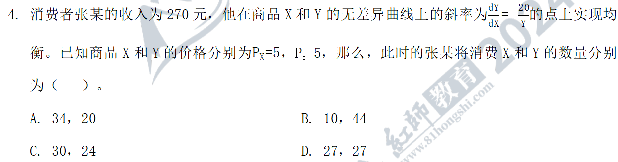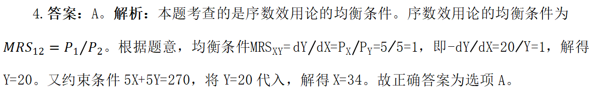 5.答案:D。解析:本題考查的是恩格爾曲線和恩格爾定律的含義。早在19世紀(jì)60年代,德國(guó)統(tǒng)計(jì)學(xué)家恩格爾對(duì)比比利時(shí)家庭調(diào)查數(shù)據(jù)分類列表,建立了在食品項(xiàng)目以及其他項(xiàng)目上的支出與家庭支出(或總支出)之間的數(shù)量關(guān)系。這些數(shù)量關(guān)系及其相應(yīng)的圖形被稱為恩格爾曲線。故選項(xiàng)AB的表述是正確的。假定商品的價(jià)格保持不變,則家庭用于某種商品的支出量與消費(fèi)量具有完全相同的性質(zhì),因此,恩格爾曲線就可以有商品的消費(fèi)數(shù)量與家庭收入之間的關(guān)系表示出來。經(jīng)過簡(jiǎn)單的轉(zhuǎn)化,收入變動(dòng)與商品消費(fèi)數(shù)量變動(dòng)的軌跡就可以由某種商品的消費(fèi)數(shù)量隨著收入變動(dòng)而變動(dòng)的軌跡描繪出來,故選項(xiàng)C正確。恩格爾定律表示隨著家庭收入的增加,食物支出的增長(zhǎng)速度不及收入同增長(zhǎng)速度,故選項(xiàng)D的表述是錯(cuò)誤的。故正確答案為選項(xiàng)D。