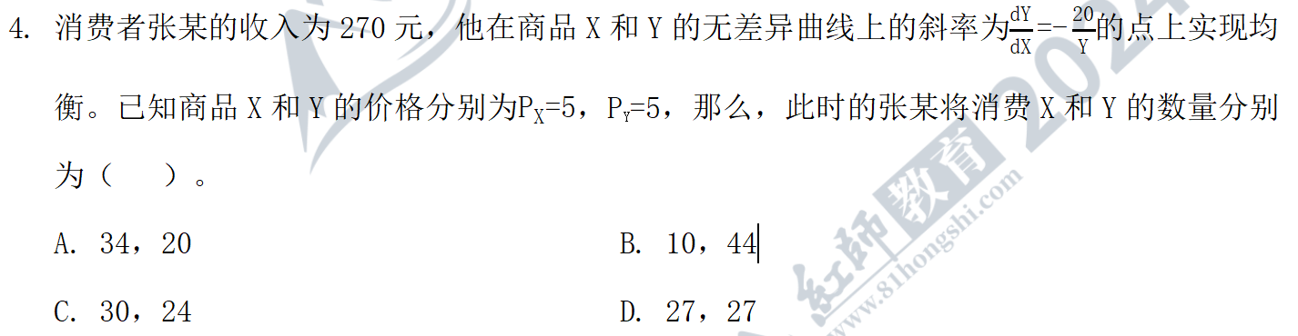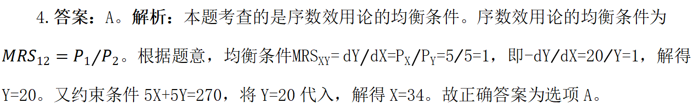 5.答案:D。解析:本題考查的是恩格爾曲線和恩格爾定律的含義。早在19世紀(jì)60年代,德國統(tǒng)計(jì)學(xué)家恩格爾對(duì)比比利時(shí)家庭調(diào)查數(shù)據(jù)分類列表,建立了在食品項(xiàng)目以及其他項(xiàng)目上的支出與家庭支出(或總支出)之間的數(shù)量關(guān)系。這些數(shù)量關(guān)系及其相應(yīng)的圖形被稱為恩格爾曲線。故選項(xiàng)AB的表述是正確的。假定商品的價(jià)格保持不變,則家庭用于某種商品的支出量與消費(fèi)量具有完全相同的性質(zhì),因此,恩格爾曲線就可以有商品的消費(fèi)數(shù)量與家庭收入之間的關(guān)系表示出來。經(jīng)過簡單的轉(zhuǎn)化,收入變動(dòng)與商品消費(fèi)數(shù)量變動(dòng)的軌跡就可以由某種商品的消費(fèi)數(shù)量隨著收入變動(dòng)而變動(dòng)的軌跡描繪出來,故選項(xiàng)C正確。恩格爾定律表示隨著家庭收入的增加,食物支出的增長速度不及收入同增長速度,故選項(xiàng)D的表述是錯(cuò)誤的。故正確答案為選項(xiàng)D。