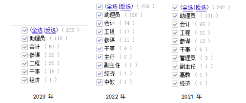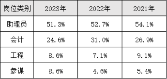 以下總結(jié)了占比最高的助理員、會(huì)計(jì)、工程、參謀四個(gè)崗位歷年招錄比例。