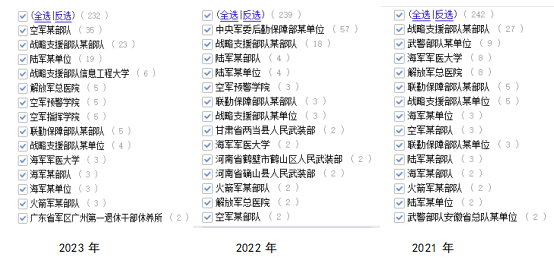 其中戰(zhàn)略支援部隊(duì)某部隊(duì),數(shù)量比較穩(wěn)定,保持在20—30個(gè)??哲娔巢筷?duì)和陸軍某單位在2021年和2022年時(shí)招錄人數(shù)很少,而在2023年時(shí)招錄數(shù)量到了20-30個(gè)。