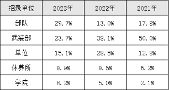 2021—2023年工商管理類專業(yè)招錄單位大部分是在部隊(duì)、武裝部、單位、休養(yǎng)所和學(xué)院等。