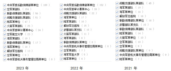 中央軍委后勤保障部某單位,2021年時(shí)招考崗位很少,在22年和23年直接漲到了150—190個(gè)。空軍某部隊(duì)在2023年時(shí)也有很大的漲幅,從個(gè)位數(shù)漲到了150個(gè)。聯(lián)勤保障部隊(duì)某部隊(duì)和陸軍某單位在2021年和2022年時(shí)招考崗位很少,在2023年時(shí)漲到了50個(gè)。