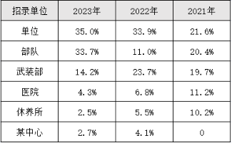 在歷年軍隊(duì)文職考試中,單位招考占比一直最高,部隊(duì)在2023年時(shí)有很大的增幅,武裝部招考崗位的數(shù)量有增有降,但總體下降。醫(yī)院、休養(yǎng)所和某中心占比也有所下降??梢?jiàn)文職招考更側(cè)重于單位和部隊(duì)。