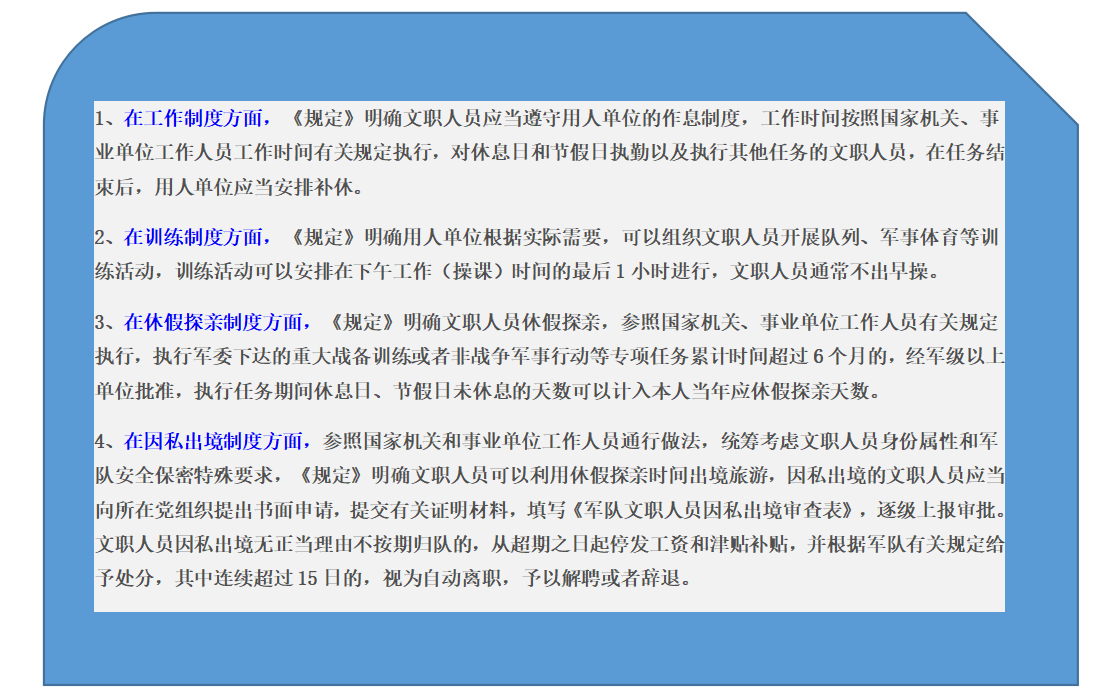 根據(jù)軍隊(duì)特殊要求和文職人員身份特點(diǎn),對(duì)涉及文職人員切身利益的具體事項(xiàng)進(jìn)行了科學(xué)合理、更為人性化的規(guī)范。