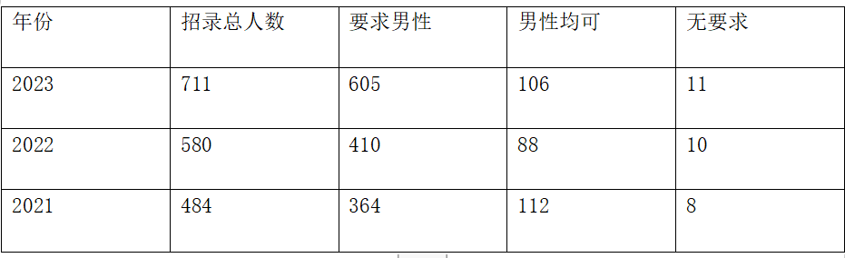可以看到,2023年漢語言文學(xué)專業(yè)招錄總?cè)藬?shù)711人,其中明確要求男性的崗位就招錄605人,占總招錄人數(shù)的85%;2022年漢語言文學(xué)專業(yè)招錄人數(shù)在580人,其中明確要求男性的崗位就招錄410人,占總招錄人數(shù)的70%;2021人招漢語言文學(xué)專業(yè)招錄人數(shù)在484人,其中明確要求男性的崗位就占總?cè)藬?shù)的75%。