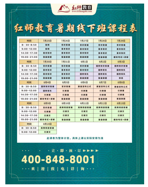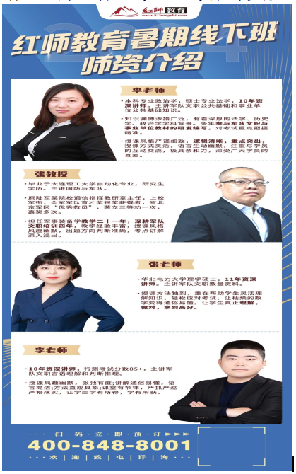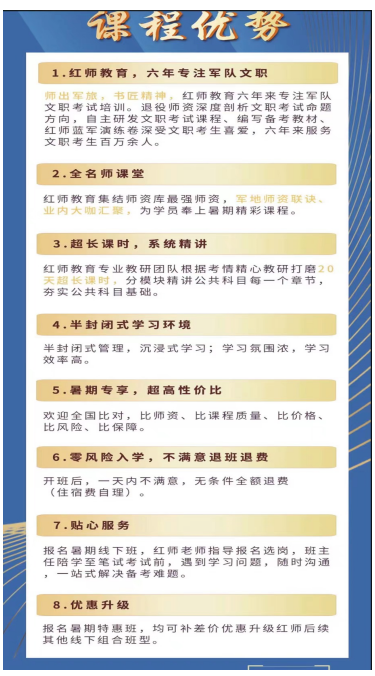 紅師教育由退役軍人創(chuàng)辦,專門從事文職的招考培訓(xùn)。他們秉承“身正為紅、學(xué)高為師”的校訓(xùn),以軍事文化的厚重和軍事化管理的嚴(yán)格,對(duì)希望邁入軍營(yíng)、成為軍隊(duì)文職人員的莘莘學(xué)子提供一對(duì)一的服務(wù)。已經(jīng)幫助諸多學(xué)子上岸軍隊(duì)文職。