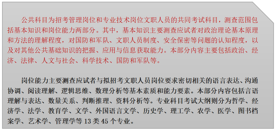軍隊文職考試內(nèi)容包括:公共科目和1門相應(yīng)專業(yè)科目,主要考核報考人員的綜合素質(zhì)和專業(yè)基礎(chǔ)。