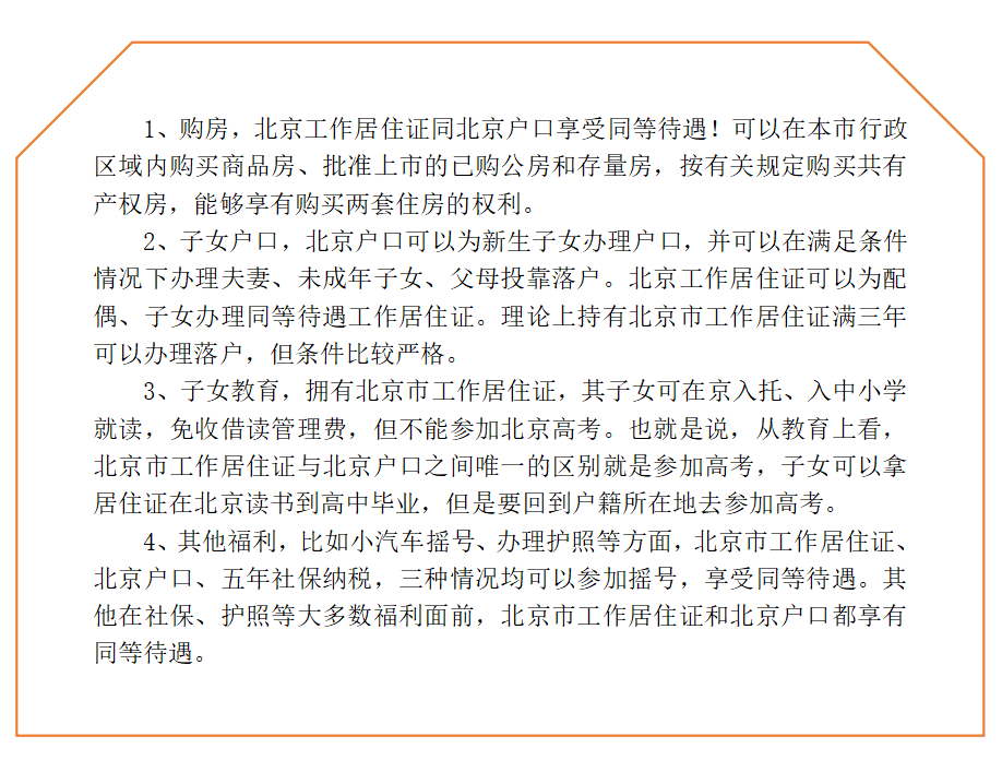 總結(jié)一下,北京戶口和北京市工作居住證唯一的區(qū)別僅僅是 “子女高考”,高考未來的改革是一個未知數(shù),發(fā)展趨勢在不斷利好,所以在沒有北京戶口的情況下,北京工作居住證是非常好的選擇。