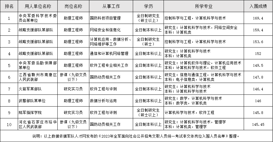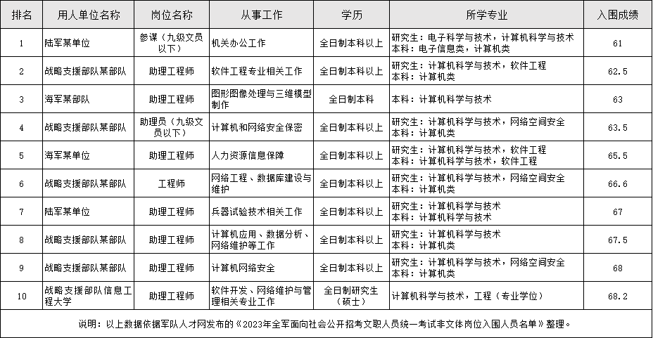 從用人單位來看,一般一些非熱門城市特別是比較偏遠(yuǎn)的城市的崗位,競爭比較小。但從計算機(jī)專業(yè)筆試分?jǐn)?shù)最低的十大崗位中可以看到。有些單位進(jìn)面分?jǐn)?shù)很低,只有60多分,大家可以參考一下,因為2024年的報考情況誰也說不準(zhǔn)。