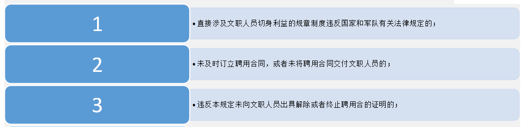 《軍隊(duì)文職人員聘用合同管理暫行規(guī)定》明確指出,用人單位有下列情形之一,給文職人員造成損害的,應(yīng)當(dāng)承擔(dān)賠償責(zé)任: