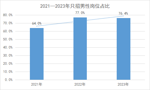 在2021年時,計算機科學(xué)與技術(shù)專業(yè)對應(yīng)崗位招收的男性占比在64%左右,在22年和23年上漲到了76%以上,只招收男性的崗位占比一直很大。