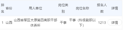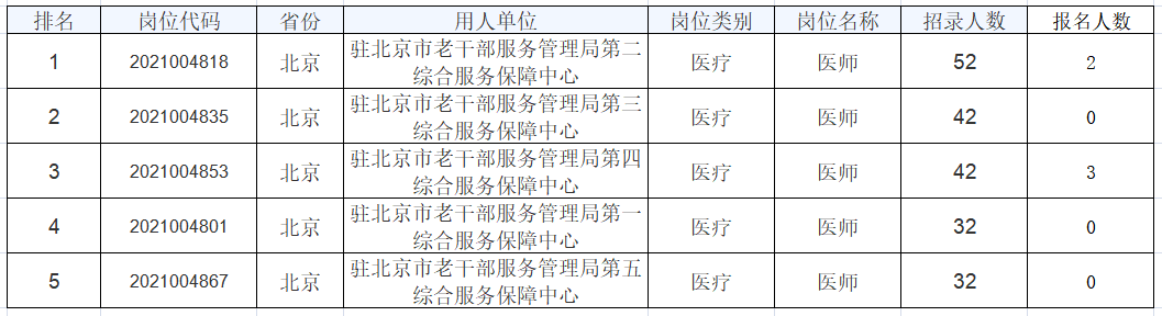 從上圖我們可以看出干休所的醫(yī)師崗位招考數(shù)量很多,報考的人卻寥寥無幾。