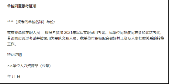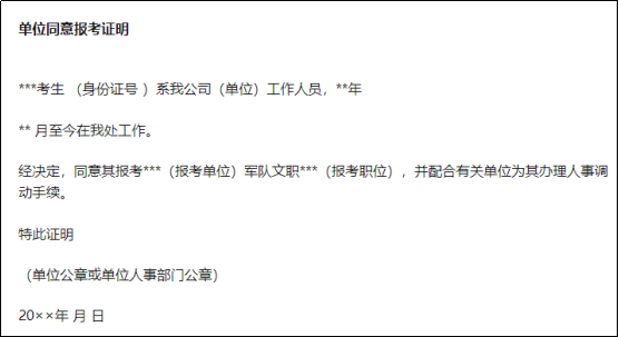 2024年軍隊(duì)文職面向社會(huì)招聘的對(duì)象為高校畢業(yè)生和社會(huì)人才,其中有很多的社會(huì)人才是在職備考。在職人員報(bào)考軍隊(duì)文職須得單位同意,并開(kāi)具《單位同意報(bào)考證明》。