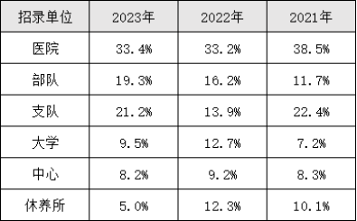 2021—2023年,臨床醫(yī)學(xué)專業(yè)可以去的單位大部分是在醫(yī)院、部隊(duì)、武警部隊(duì)某支隊(duì)等,少數(shù)在大學(xué)、療養(yǎng)中心、離職干部休養(yǎng)所等。
