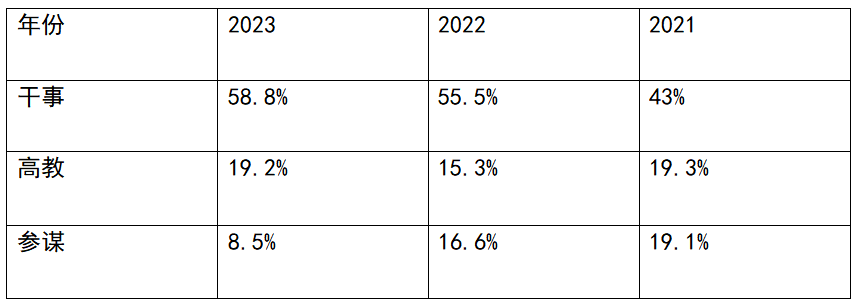 以上表格是近三年(2021年到2023年)備考政治學(xué)上岸的考生從事工作崗位類別名稱占比(前三)。可以看到,近三年備考政治學(xué)科目被招錄的考生從事的崗位類別前三分別是干事崗(科級(jí)副職以下)、高教崗(科級(jí)副職以下)和參謀崗(科級(jí)副職以下)。政治學(xué)專業(yè)科目涉及的工作單位比較集中在武裝部、干休所和院校科研等單位,如下圖所示:
