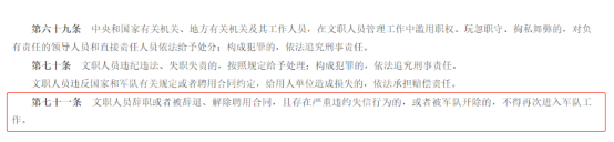 《中國人民解放軍文職人員條例》第七十一條規(guī)定:文職人員辭職或者被辭退、解除聘用合同,且存在嚴重違約失信行為的,或者被軍隊開除的,不得再次進入軍隊工作。