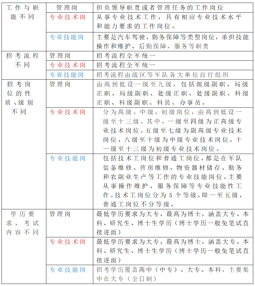 軍隊文職崗位有三大類:管理崗、專業(yè)技術(shù)崗、專業(yè)技能崗。