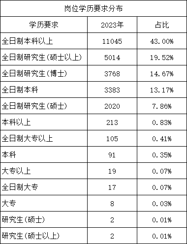 高學(xué)歷的優(yōu)勢(shì)就比較大量,985/211重點(diǎn)大學(xué)的優(yōu)先,研究生、博士生也是優(yōu)先考慮的。其中碩士及博士的要求占比達(dá)到了42.1%。所以各位高學(xué)歷的朋友們,這一要求瞬間給你解決了大部分的競(jìng)爭(zhēng)對(duì)手,可以放心選擇了。不過(guò)對(duì)本科學(xué)士學(xué)位人才的需求量是最大的,在57.4%左右。從去年的數(shù)據(jù)看來(lái)專(zhuān)科只有149個(gè)崗位可報(bào)考。所以專(zhuān)科也是可以報(bào),但是可選擇的崗位有限。