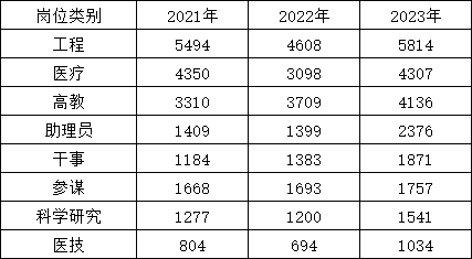 2021—2023年,軍隊文職主要招收工程、醫(yī)療、高教崗。參謀崗的數(shù)量基本保持一致。2023年時,助理員崗和干事崗的數(shù)量超過了參謀。