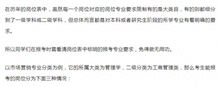 考生一定要注意看崗位表中對專業(yè)要求,有的崗位專業(yè)要求限制有的是大類目,有的則都細(xì)分到了一級(jí)學(xué)科或二級(jí)學(xué)科,但總體而言都是對本科或者研究生階段的所學(xué)專業(yè)有著明確的要求。所以同學(xué)們在報(bào)考時(shí)需看清崗位表中標(biāo)明的報(bào)考專業(yè)要求,免得做無用功。