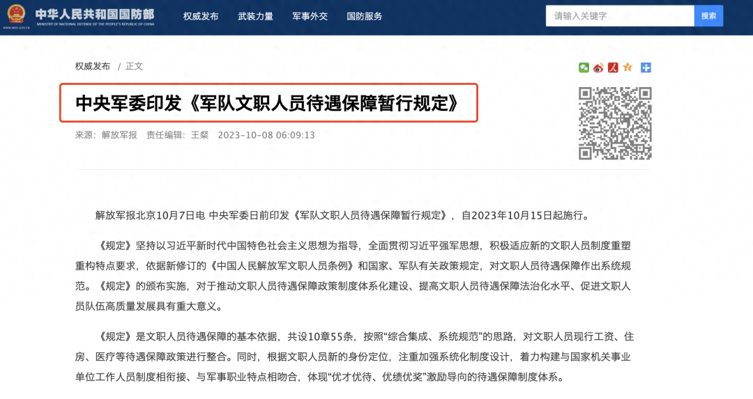 根據(jù)報道,中央軍委日前印發(fā)《軍隊文職人員待遇保障暫行規(guī)定》,自2023年10月15日起施行。