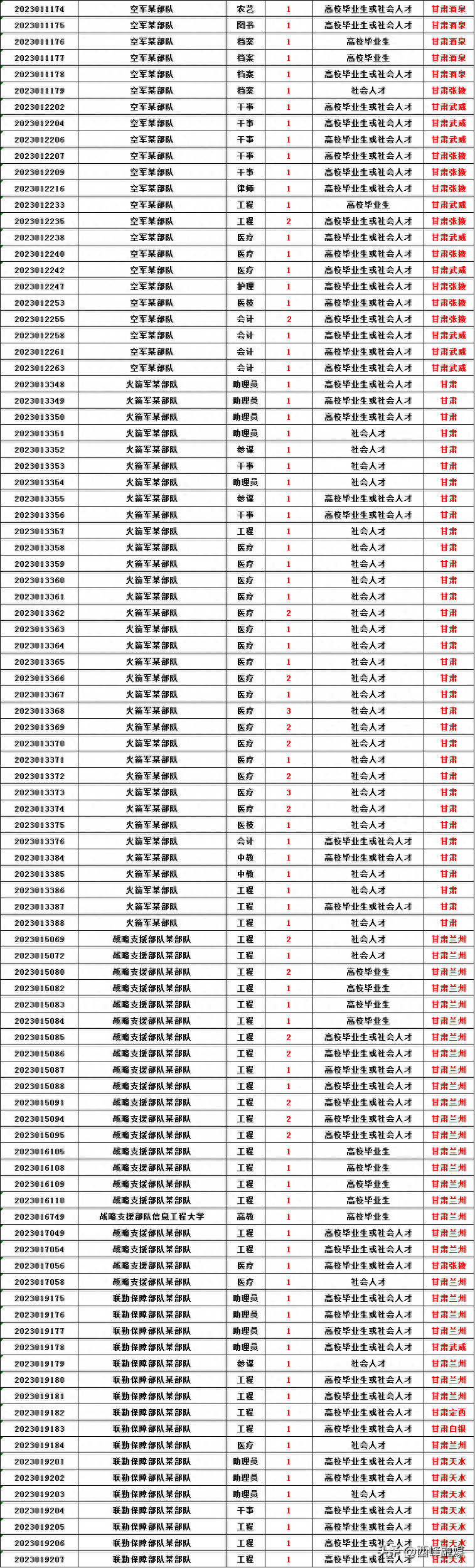 軍隊(duì)文職人員的招考對象為普通高等學(xué)校畢業(yè)生或者社會人才。其中:普通高等學(xué)校畢業(yè)生包括應(yīng)屆畢業(yè)生和非應(yīng)屆畢業(yè)生,應(yīng)屆畢業(yè)生是指2023年畢業(yè)且在當(dāng)年取得相應(yīng)畢業(yè)證和學(xué)位證的畢業(yè)生;非應(yīng)屆畢業(yè)生是指在兩年擇業(yè)期內(nèi)未落實(shí)工作單位,其戶口、檔案、組織關(guān)系仍保留在原畢業(yè)學(xué)校,或者保留在各級畢業(yè)生就業(yè)主管部門(畢業(yè)生就業(yè)指導(dǎo)服務(wù)中心)、各級人才交流服務(wù)機(jī)構(gòu)和各級公共就業(yè)服務(wù)機(jī)構(gòu)的2021年、2022年未就業(yè)普通高校畢業(yè)生。