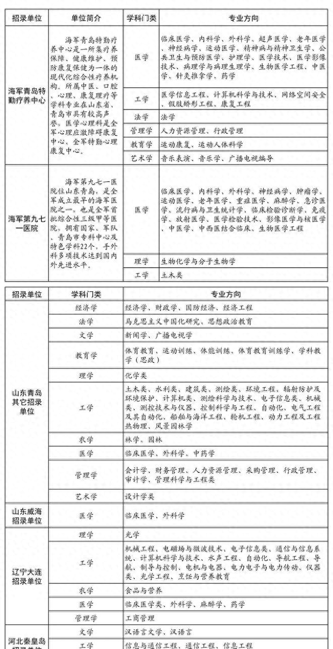 隨著時(shí)代的發(fā)展和軍事現(xiàn)代化的步伐,我國(guó)軍隊(duì)不斷地進(jìn)行自我更新和進(jìn)步。2024年,北部戰(zhàn)區(qū)海軍向社會(huì)廣泛尋找管理及專業(yè)技術(shù)類文職人才,共計(jì)144名。這次的招募涵蓋了眾多領(lǐng)域,如醫(yī)療、財(cái)務(wù)、電子通信、計(jì)算機(jī)、機(jī)械、電氣、土木、法學(xué)、管理和教育等專業(yè)。所涉及的工作地點(diǎn)主要分布在我國(guó)的山東青島、山東威海、遼寧大連和河北秦皇島等城市。