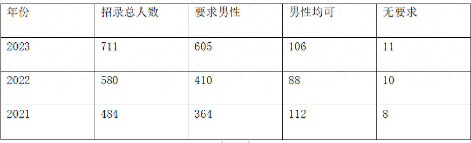 可以看到,2023年漢語言文學(xué)專業(yè)招錄總?cè)藬?shù)711人,其中明確要求男性的崗位就招錄605人,占總招錄人數(shù)的85%;2022年漢語言文學(xué)專業(yè)招錄人數(shù)在580人,其中明確要求男性的崗位就招錄410人,占總招錄人數(shù)的70%;2021人招漢語言文學(xué)專業(yè)招錄人數(shù)在484人,其中明確要求男性的崗位就占總?cè)藬?shù)的75%。