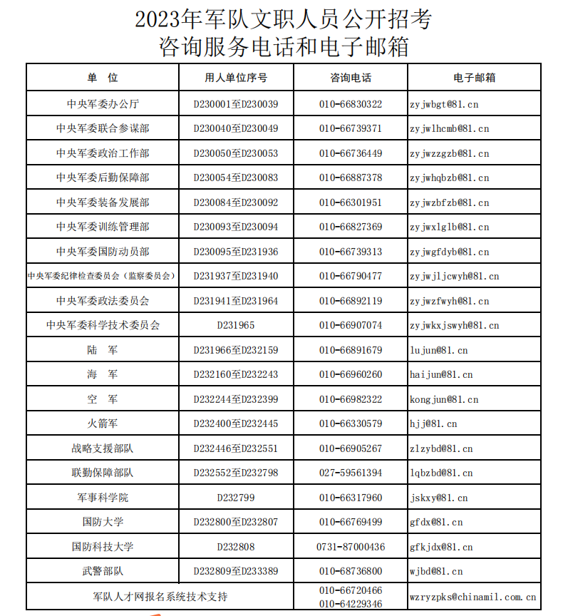 2024年軍隊(duì)文職人員公開(kāi)招考咨詢服務(wù)電話和電子郵箱