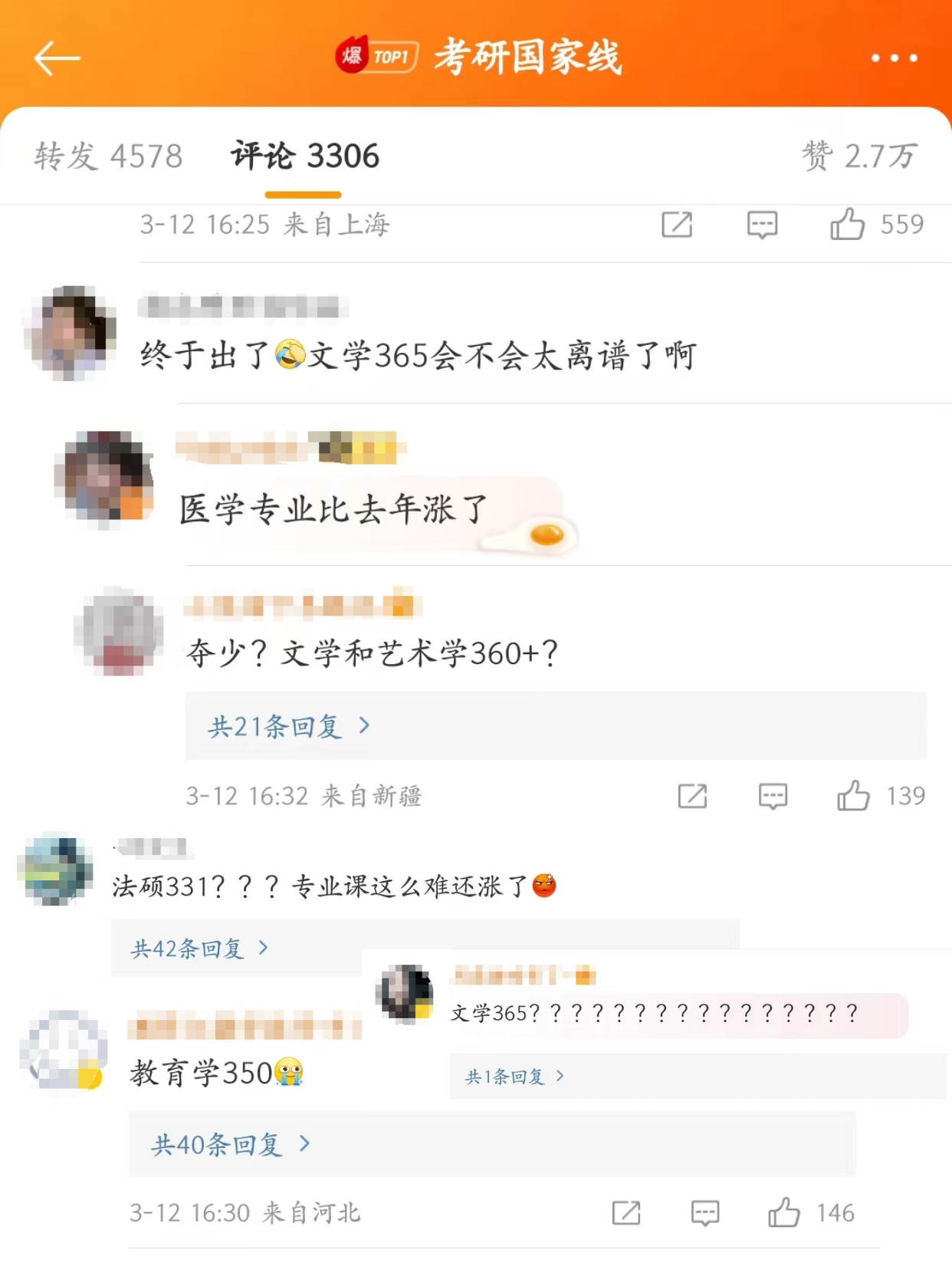 今天下午,2024年考研國(guó)家線出了,一經(jīng)發(fā)布,便直接沖上熱搜,經(jīng)各位考生的反響來看,眾多專業(yè)的國(guó)家分?jǐn)?shù)線漲了。小編摘了幾條評(píng)論如下: