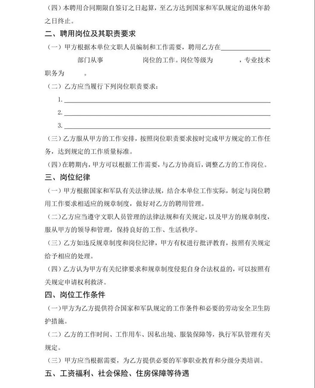 文職人員聘用合同文本式樣,由軍委政治工作部制定,并根據(jù)需要適時作出修訂。聘用合同文本一式3份,分別由用人單位和文職人員各執(zhí)1份,有任免權(quán)限單位的政治工作部門存檔1份。