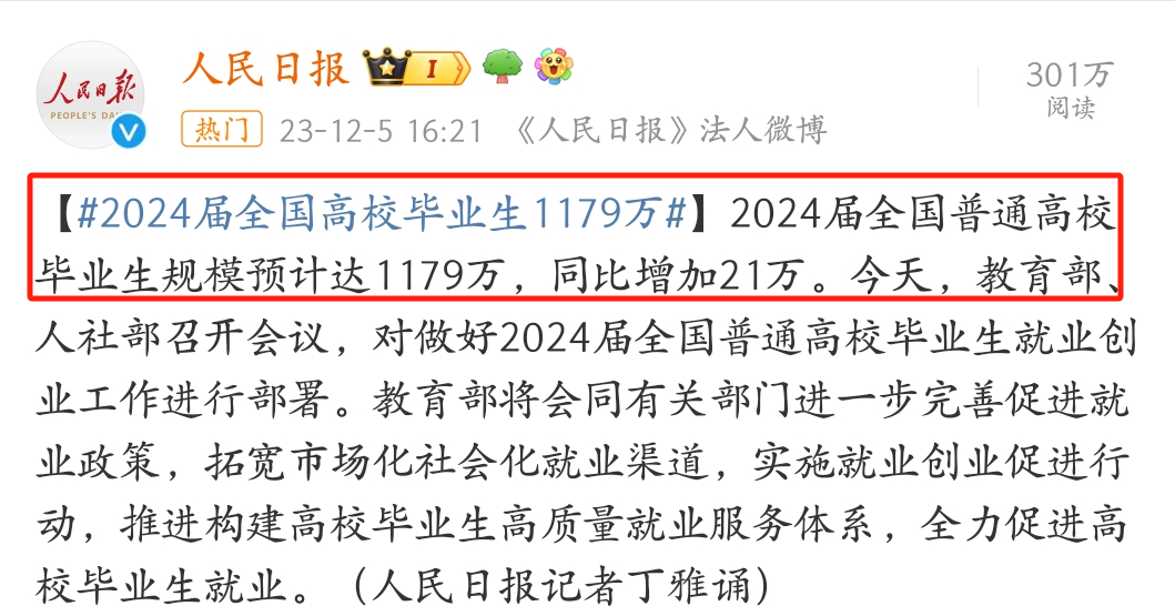 根據(jù)人民日報發(fā)布的信息可知:2024屆全國高校畢業(yè)生規(guī)模預(yù)計達(dá)1179萬人。