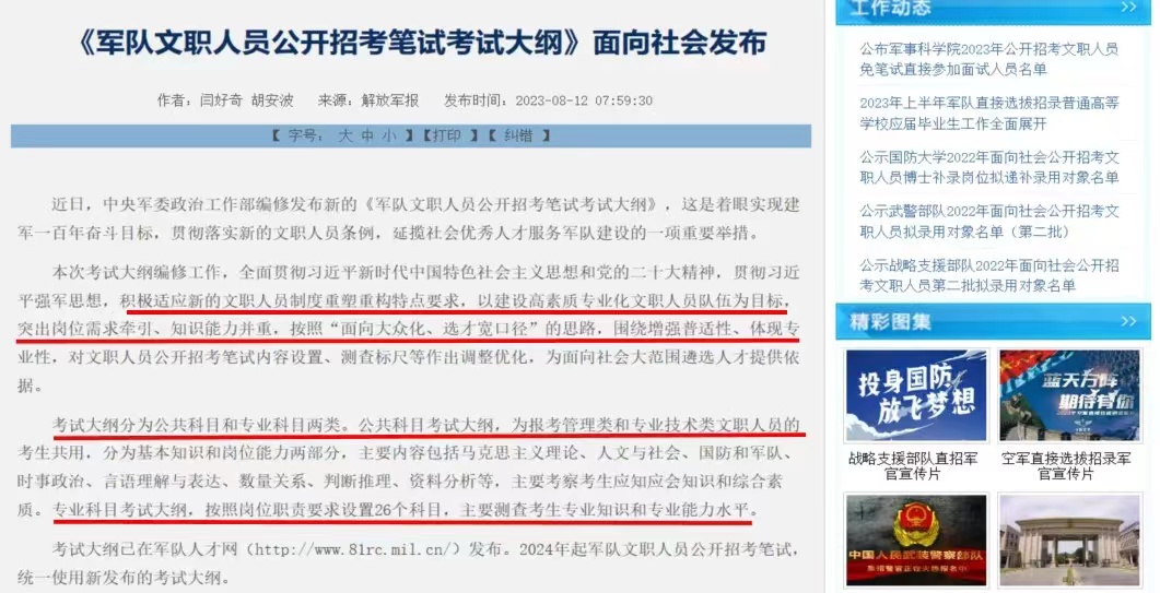 8月12日,軍隊(duì)人才網(wǎng)正式發(fā)布“《軍隊(duì)文職人員公考招考筆試考試大綱》面向社會(huì)發(fā)布” ,2024年開始使用。