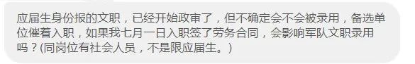 而且軍隊(duì)文職作為有編制的職業(yè),審核是比較嚴(yán)格的,如果公示前你和別的公司簽了合同,即使招考單位沒有主動(dòng)察覺,也有可能被別人舉報(bào),導(dǎo)致被取消入職資格。