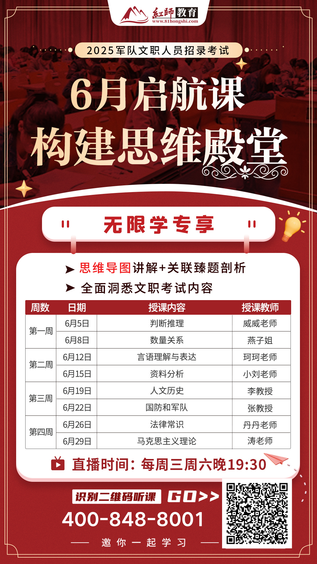 紅師的師資骨干大多是軍隊(duì)退役的教授,他們有的軍旅生涯幾十載,在部隊(duì)的各個(gè)崗位工作過(guò),對(duì)部隊(duì)尤其是文職崗位了如指掌。紅師采用雙師授課—地方+軍隊(duì)退役師資。他們的共同點(diǎn)是,對(duì)軍隊(duì)文職考試有著深入的教學(xué)研究,從考試難度、考試題型、考試的軍隊(duì)特色、考試的組織管理等多方面進(jìn)行了分析,對(duì)每一個(gè)考點(diǎn)都進(jìn)行了深入的發(fā)掘。此次研討會(huì)只為能給學(xué)員提供最具價(jià)值的筆面試指導(dǎo)。